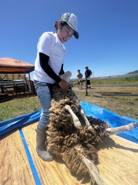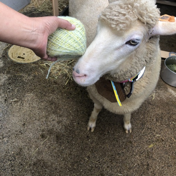 | 今年私が初めて毛刈りした うちの子ララちゃんの毛糸を使って、フカフカのハンドウォーマーを編みます。 |