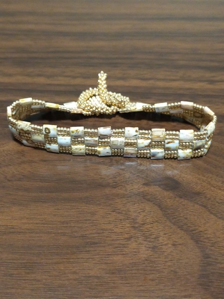 | タイルみたいで2つ穴が空いているビーズと特小ビーズをメインに使っています。 特小ビーズや留具に使った金色のビーズは汗等に強い加工がされています。 留具もビーズを編んで制作しました。 |