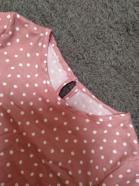 本(茅木真知子ホームクチュールセレクション 23冊のソーイングブックから)の通り、襟ぐりを共布にしてパイピングしました。
