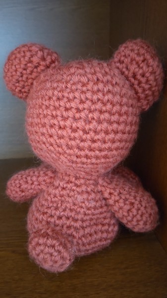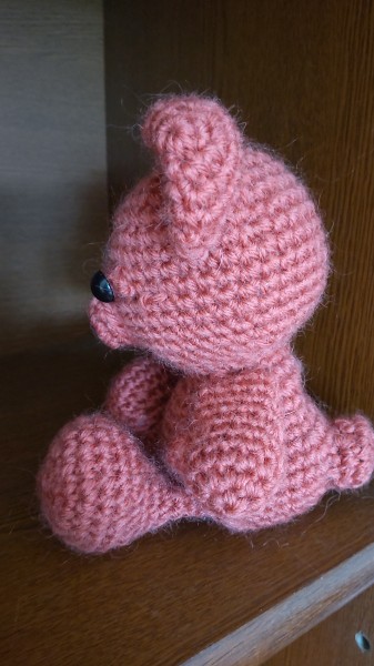 | ネット上に上がっている編みぐるみを見るうちに作ってみたくなってトライしてみました。この前にも一つ作ったのですが、針のサイズと糸の太さがあっていなかったためうまく行かず途中で諦めてしまいました。ここに上げたのは実質上1作めですが、本当は2作め?使ったのは家にあったありあわせの毛糸。以前の失敗があったので、針は太めにしました。 編むこと自体は大丈夫だったのですが、手足を付けるところに苦労しました。縫い目が目立ってまだまだ不満足。でもとりあえず、1作完成して嬉しかったです。 |