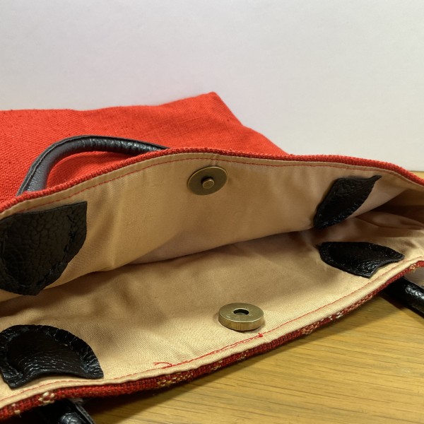 帯のリメイクバッグ。持ち手は百均の合皮なのですがかなり薄いので強度は低そうです。
