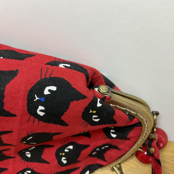 ネコ柄がま口ミニショルダー。接着芯だけだと口金に対してスカスカで嵌めるとき大変でした。