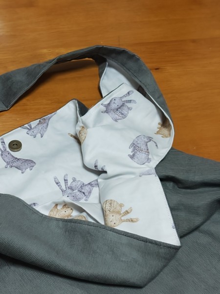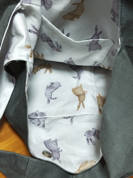 コーデュロイ生地で毛並みが揃うように、大好きなウサギの裏地も上下柄がある生地だったので下で繋ぎました。