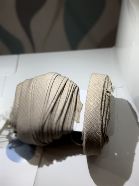 裏地はつけないのでバイアスコードで裏処理することに。そのバイアスコードは手持ちの布から作りました。光沢があって少しキラキラしてて可愛い♡