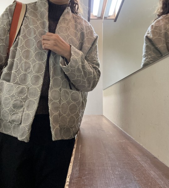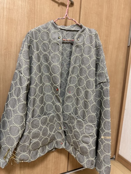 一応完成はした。(1枚目はひっくり返した裏側です。)早速着てお出かけもして可愛いジャケットで気持ちは高まった!しかしその後、やっぱり裏のバイアス処理が汚い部分が目につき(第三者からも指摘されて背中押されました)またその後解体する事に〜完成したけど、また逆戻り(笑)