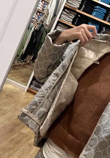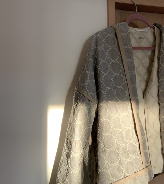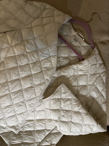 最近寒くなってきて、せっかくジャケット作るなら防寒仕様にアレンジしよう!と。思い立ったらユニクロにいました。ライナー用のダウンを探してきました。ジャケットの内側にライナー取り付け用のボタンとか付けようかなって考えてます
