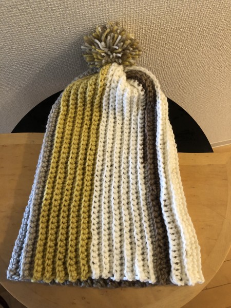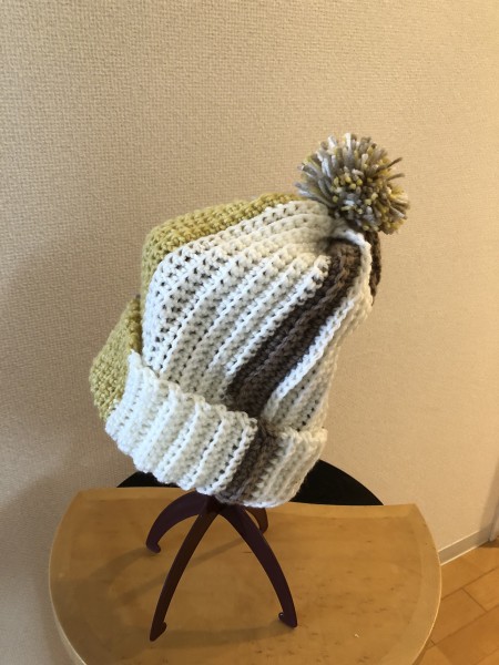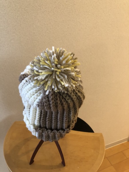 細編みのうね編みで伸縮性のあるニット帽を編みました。ポンポンは巻きを少なめにして大人っぽくしました。