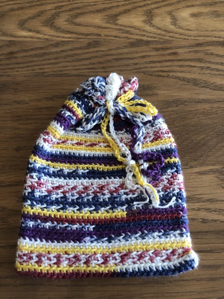 ミルフィムソックヤーンの1玉使い切りで色違いでカラフルな巾着を編みました。