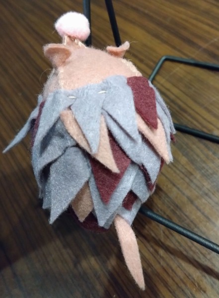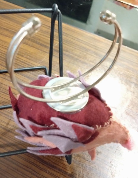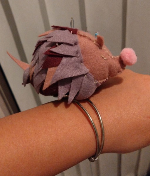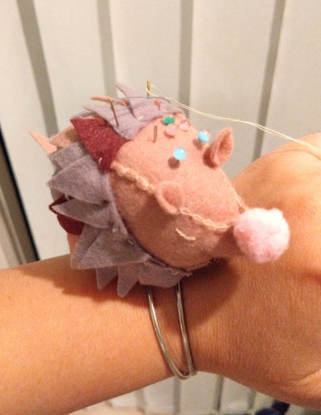 ハリネズミのアームピンクッションです。腕につけられる針山です。