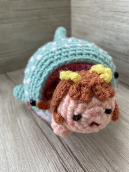ジンベイザメと人魚を編みました。人魚は、ジンベイザメの口の中に入れます。