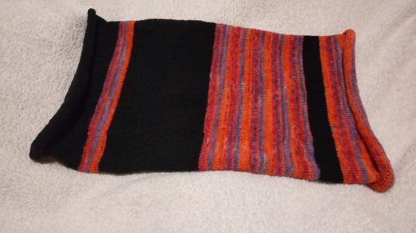 | Opal毛糸で夫の腹巻き帽子作ります。 魔法の毛糸フェアで見た作品を参考に、鮮やかなオレンジ系と黒のツートンカラーです。 ちょっと遅れたクリスマスプレゼントになりましたが、とても喜んでくれました。 |