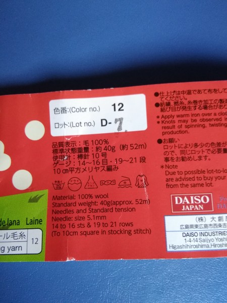 今年も100円ショップで新しい糸を買ってしまった、、、 スペースを少しでも広げようと、残り糸の消費活動 1玉残っていた極太を帽子に。 極太なので、あっという間に完成 昔のダイソーの糸、ウール100で1玉40gです