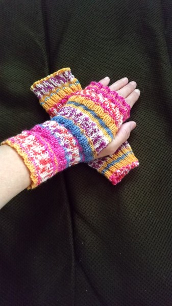 2目ゴム編みをアレンジした模様編みのハンドウォーマー。