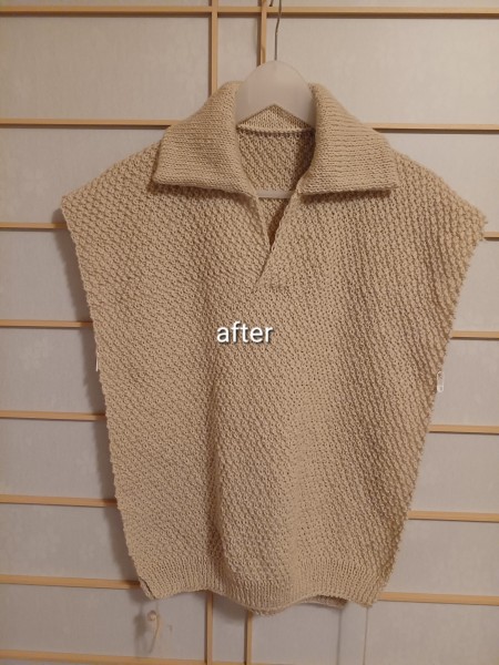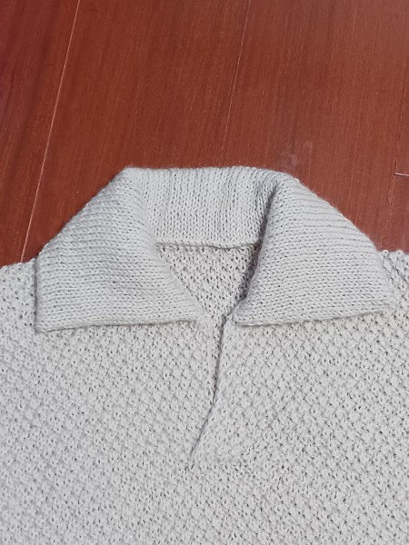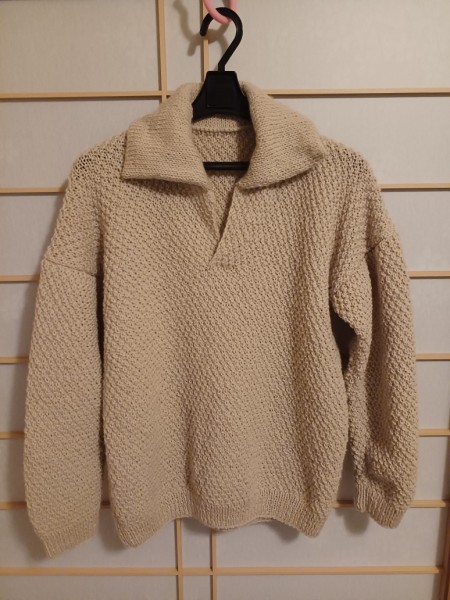 | 全体は鹿の子編みでシンプルに、大きめの襟を特長にしたセーター、ようやく完成しました。 ライトの違いで別物みたいな写真になってますが、色はベージュです。 今回、行き当たりばったりで編み始めたので、いろいろ迷走しましたが、何とか満足できる物になりました。 編み目の確認とバランスは大事ですね。 |