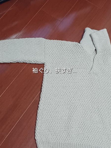 袖を付けてみたら、袖ぐり狭すぎてバランス悪いし、前身ごろに編み間違いを発見!!