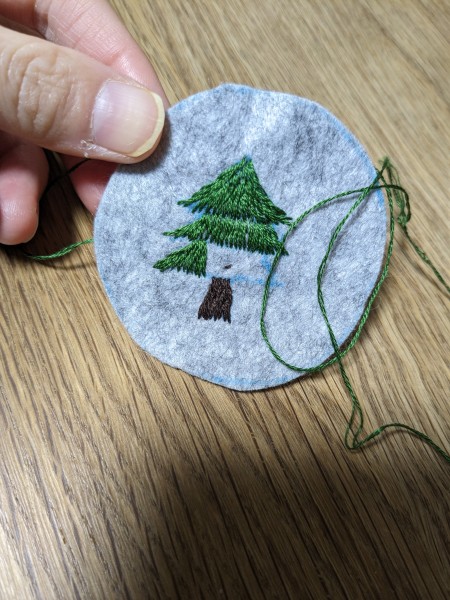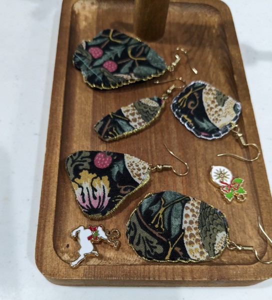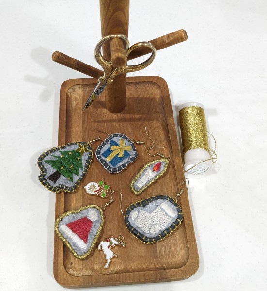 | 余りフェルトで何となく作り始めたツリーの刺繍から、クリスマスのピアスを5つ作りました。 Aonecoさんのクリスマスモチーフ刺繍図案が合いそうだったのでダウンロードして刺繍しました。5種類のピアスにしました。 |