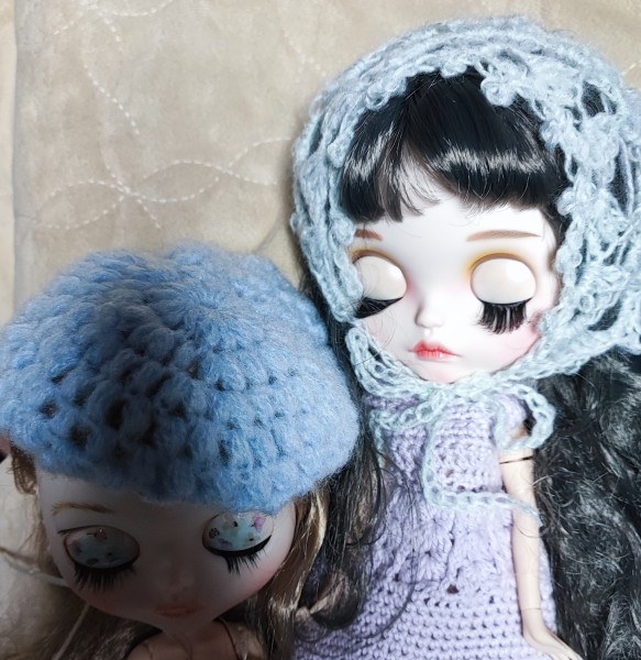 ベレー帽とバブーシュカ。 30cmのお人形さんに編みました。 モヘアの余り毛糸で在庫整理を兼ねて。 ピコット編みが楽しかったのでSeriaで好きなモヘアを購入してしまい、バブーシュカをもう1個編みました。10月31日完成。 YouTubeあみぶらすきーさんを参考にしています。