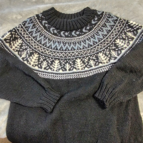 初めてトップダウンで編むセーターでした。 編み込み模様が大変でしたが楽しかったです。 丁度良いサイズでピッタリに編めました。