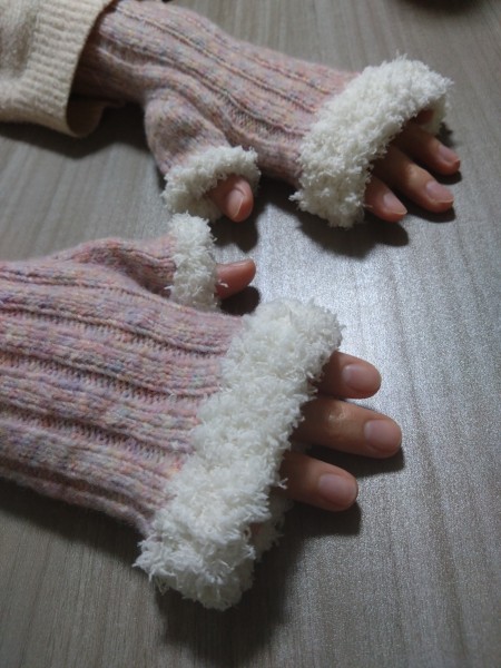 前回のハンドウォーマーの改良版 親指が寒かったので、親指の第一関節まで、メリアス編みして、モコモコファーをつけてみた