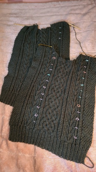 履き口から編む編み方で編みました。 偶然、左右同じ模様になりました。