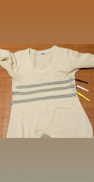 身頃を編んだ後に、アクリル絵の具で編地にペイントしたところが楽しかたです。