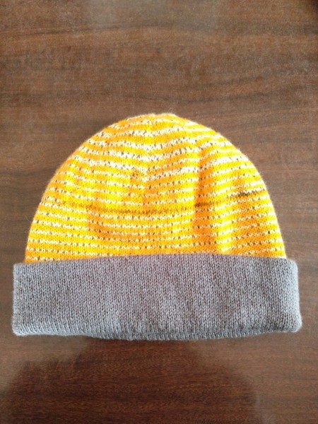 • ミミというフワフワ糸の残りを消費するため、ケークを2玉買い足し、YouTubeの「ぷち編みPetit_Ami」さんのシマシマ帽子を作成。