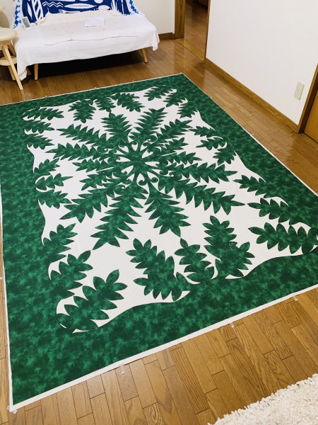 ハワイアンキルトのベッドカバー 『Tree Fern & Lauae Lei』 size:W190cm×H260cm Design:"PONO" Tomoko Kato 独り立ちした友人の子へのプレゼント用として。