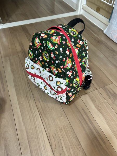 登園リュックの練習台。 これから娘の登園リュックを作るのに、最初からミスなく作れないので、まず練習にクリスマス生地で作りました。 布端はジグザグミシンのみ。 娘のはバイアステープつけるつもりです。