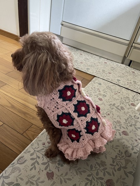 バックオープンのベストです お花のモチーフをつなぎつくりました 胸とお腹は一色で 裾は胴が長くてフリルを2段にしています