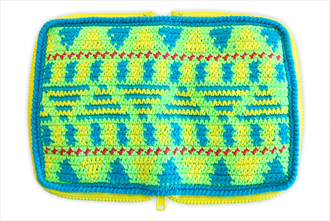 使用糸はダルマ毛糸の「小巻cafeデミネオ」です。蛍光色の糸は大きな作品にはちょっと抵抗があるかもしれませんが、小物だからこそ元気なビタミンカラーで遊んでみませんか?ファスナーや内ポケットの色を替えるだけで印象もガラリと変わるので、本体が出来たらいろんな色合わせを楽しんでみてくださいね!