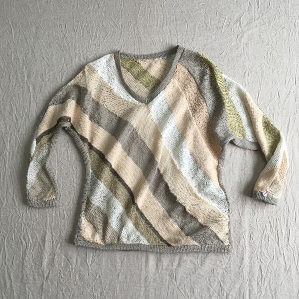 knit-c斜め編みの作品です。使用した糸がそれぞれゲージがちがうのでゲージを合わせるのが大変でした。