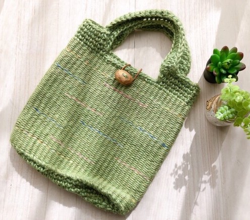 日本輪織り協会代表ダンボール板の簡単織り機<おりりん®>を使い、両面続けて輪っかの織地を作ってから 底や持ち手をカギ針編みで仕上げました。裏地もついて、使い勝手抜群の麻ひもバッグです。