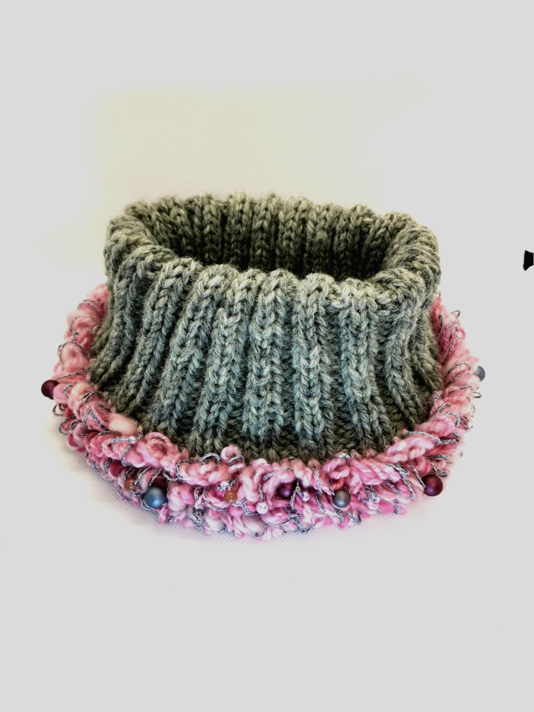 編み地サンプルは 長編み10目2段、お花のモチーフ、ネットにストレートに編み付け