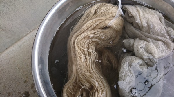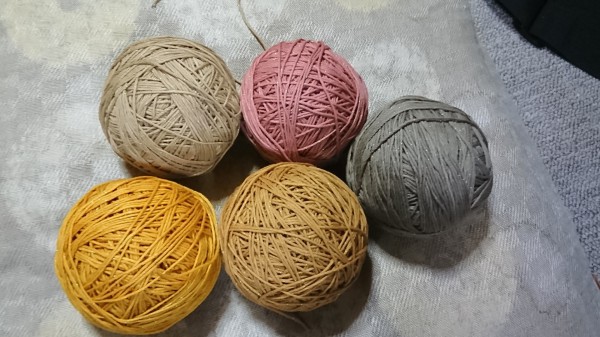 草木染めした糸で手編みしてます。手紡ぎ修行中。